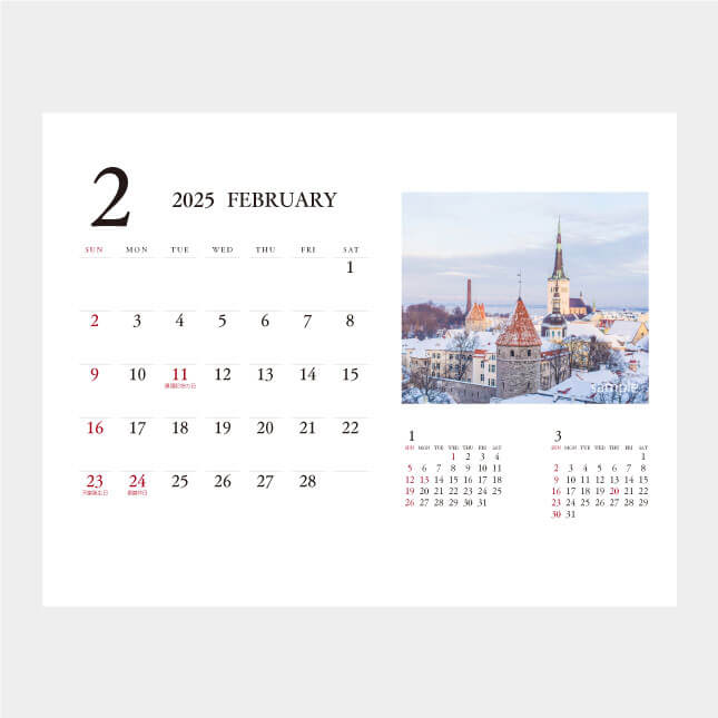 海外に支店があるので現地の祝日を入れたい!という方にご好評のカスタマイズできる卓上カレンダーはいかがでしょうか。こちらは各ページに写真を追加できるタイプ。オプションで表紙にも写真を追加できますよ。