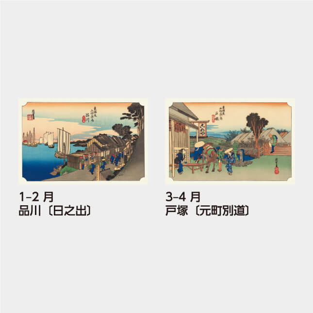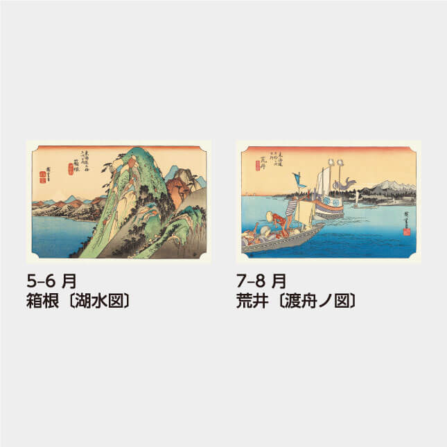 江戸時代の浮世絵師、歌川広重の「東海道五十三次」より選りすぐりの作品を掲載。西洋での知名度はピカイチです!中央部分には各作品の解説がついています。 ※外玉仕様あり