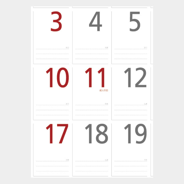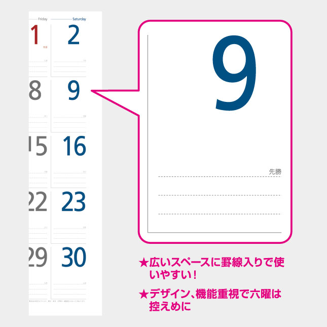 大きく見やすい文字とたっぷりのメモスペースで実用性に富んだ3色文字月表です。