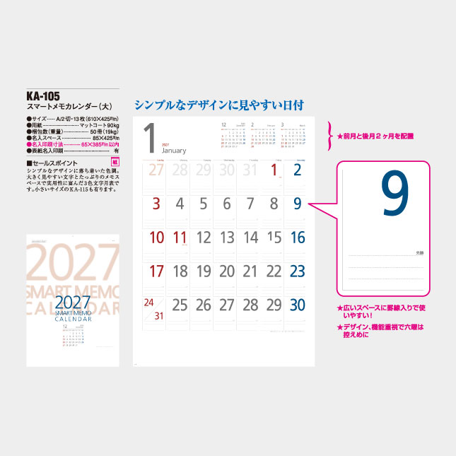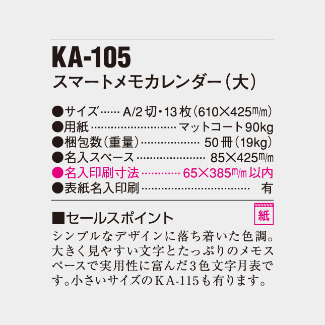 スマートメモカレンダー A/2切(大) KA-105 の特徴