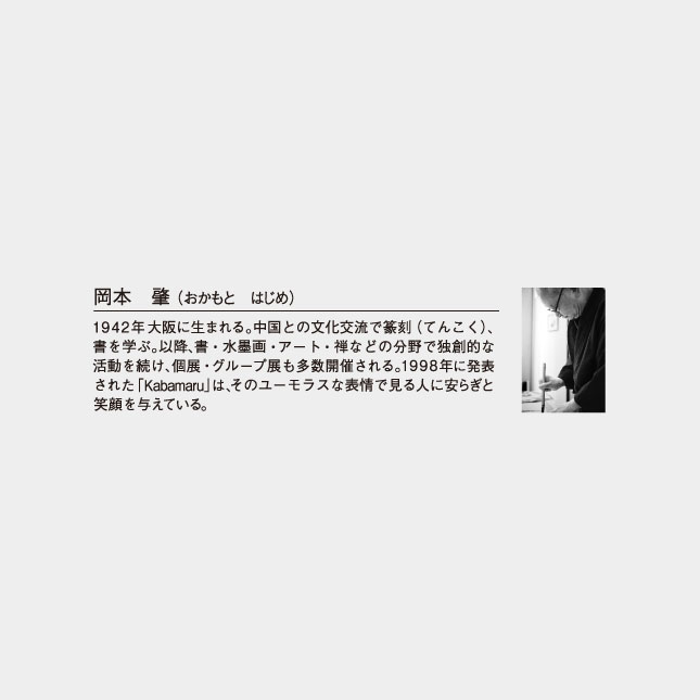 1942年大阪に生まれる。中国との文化交流で篆刻(てんこく)、書を学ぶ。以降、書・水墨画・アート・禅などの分野で独創的な活動を続け、個展・グループ展も多数開催される。1998年に発表された「Kabamaru」は、そのユーモラスな表情で見る人に安らぎと笑顔を与えている。