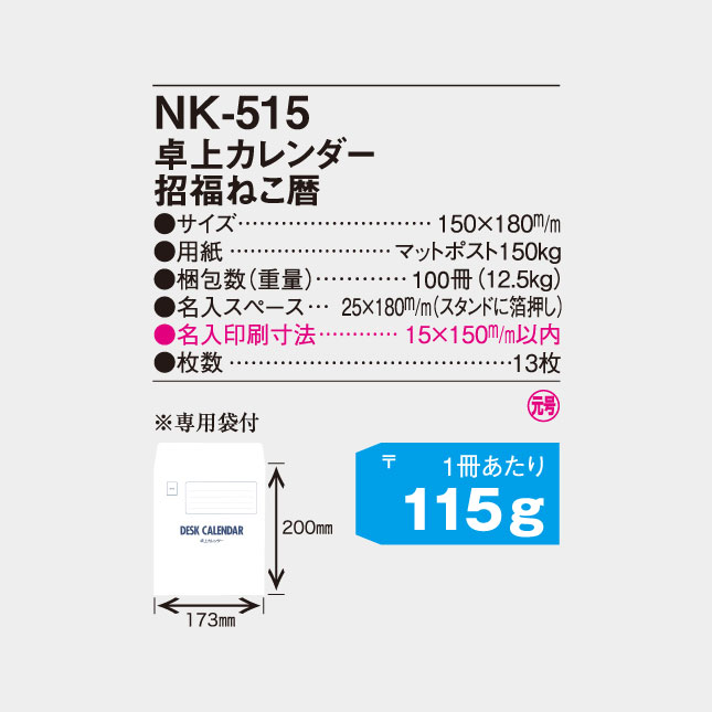 NK-515 卓上 招福ねこ暦【150×180mm】