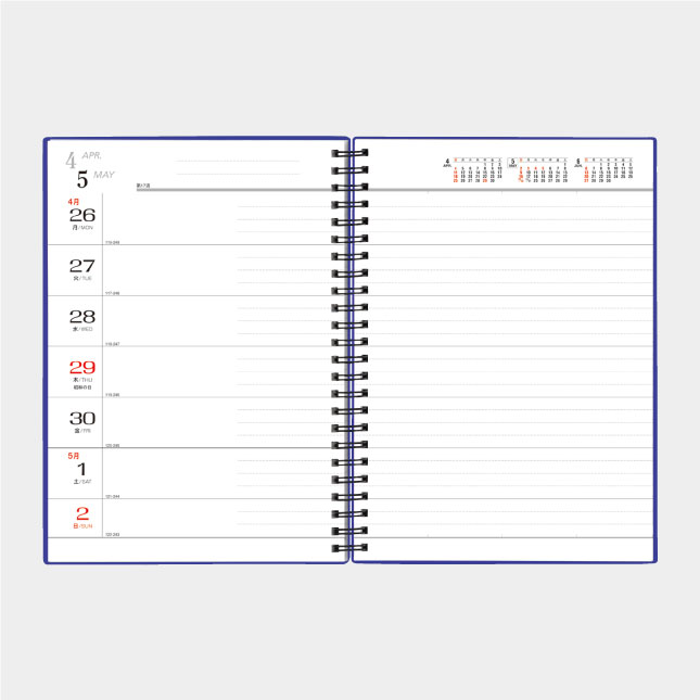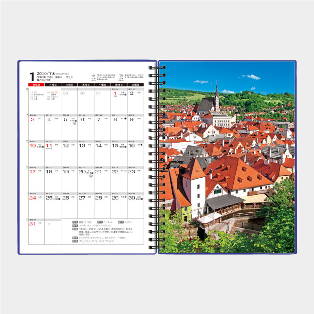 【仕様替!】5段組6週間表示に変更。見返しを無地に変更。世界地図と晴雨表なしに。年表掲載位置変更。カバー素材変更に伴い商品名変更。カバー色の表記を紺から青に。