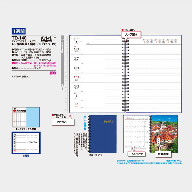 A5ダイアリー・世界風景1週間(白・カバー再生PP)TD-140 の特徴
