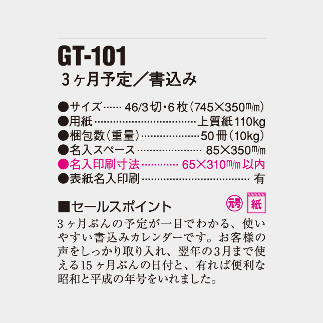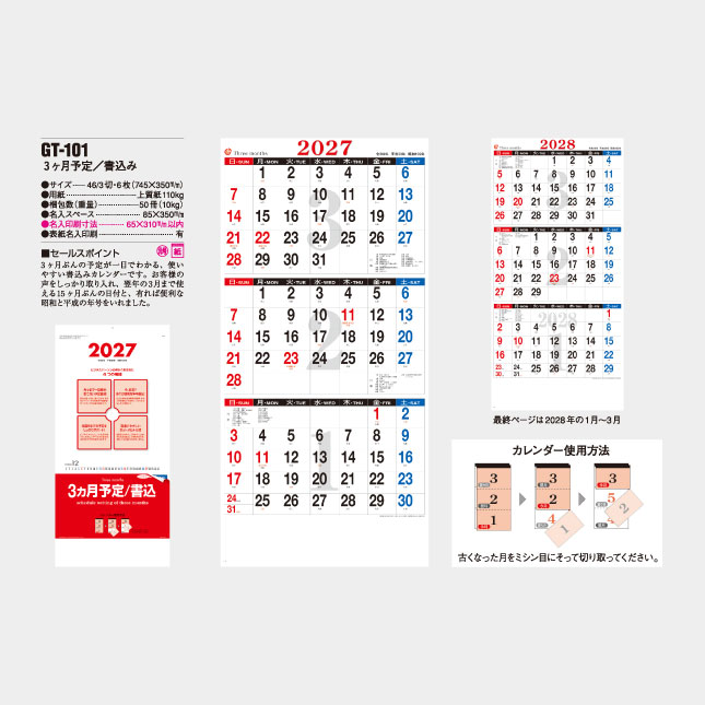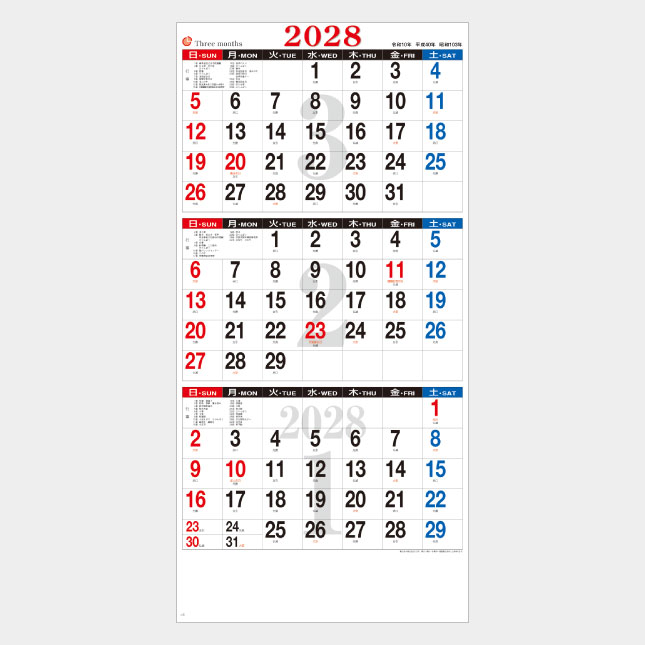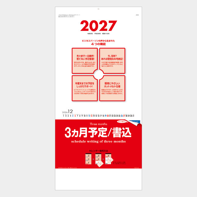 お客様の声をしっかり取り入れ、翌年の3月まで使える15ヶ月ぶんの日付と、有れば便利な昭和の年号をいれました。