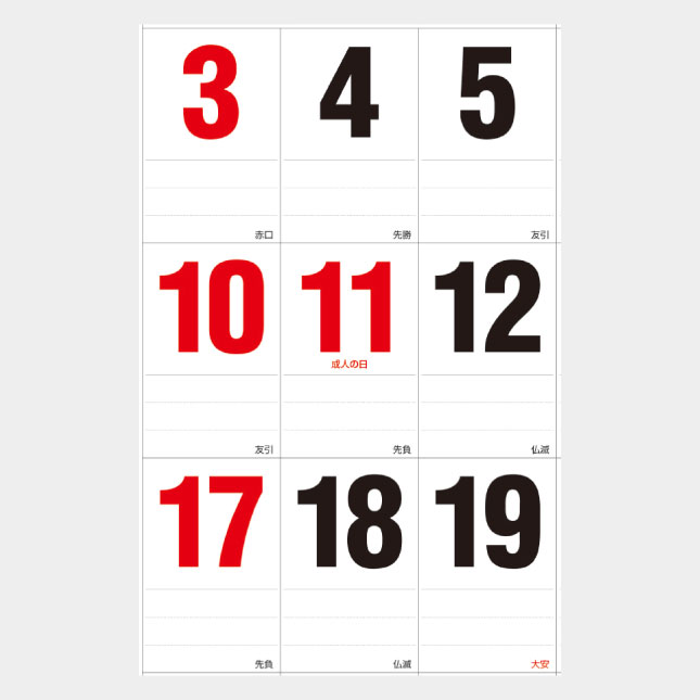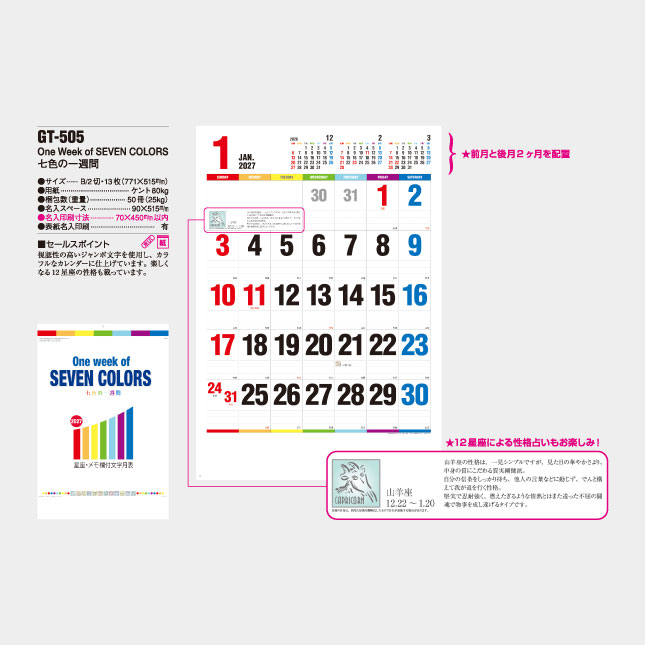 視認性の高いジャンボ文字を使用し、カラフルなカレンダーに仕上げています。