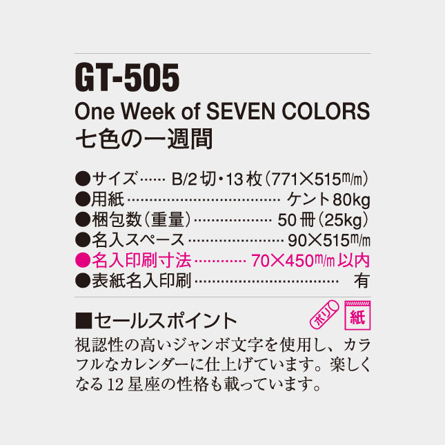 One Week of SEVEN COLORS 七色の一週間 GT-505 の特徴