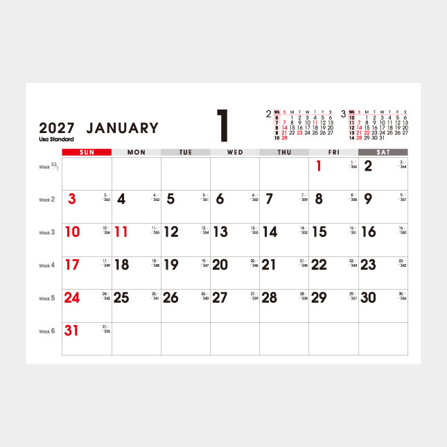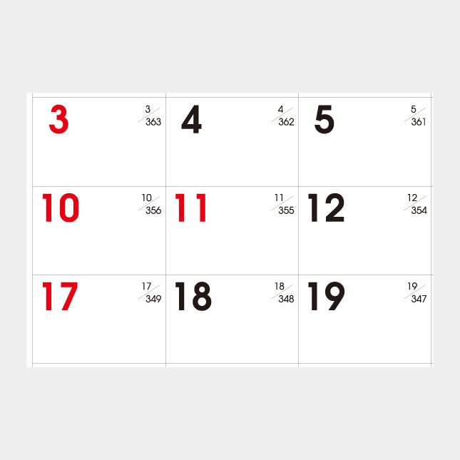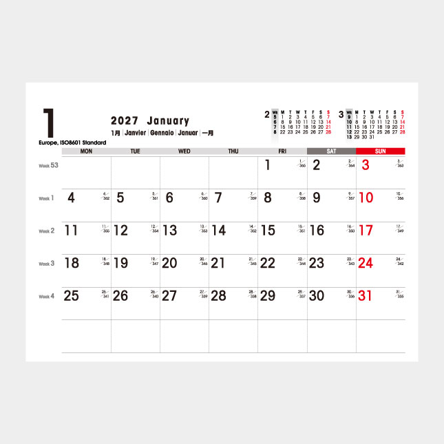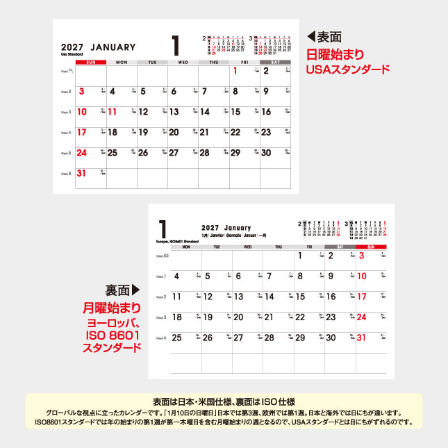グローバルな視点に立ったカレンダーです。「1月10日の日曜日」日本では第3週、欧州では第1週。日本と海外では日にちが違います。ISO8601スタンダードでは年の始まりの第1週が第一木曜日を含む月曜始まりの週となるので、USAスタンダードとは日にちがずれるのです。