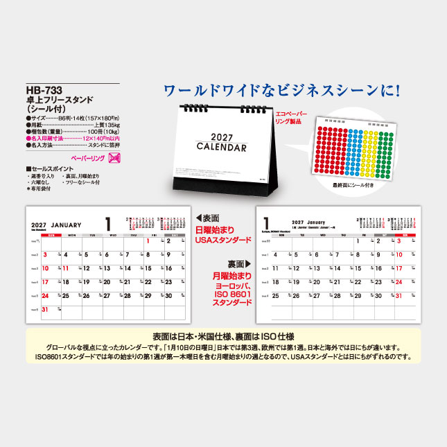 表面は日本・米国仕様、裏面はISO(ヨーロッパ)仕様の月曜始まりです。シール付き。