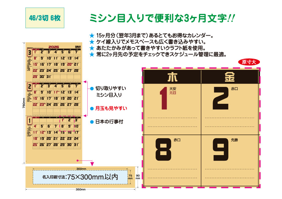 予定管理に使いやすく非常に人気の高い3ヶ月文字。切りやすいミシン目入りで、常に2ヶ月先を表示できます。