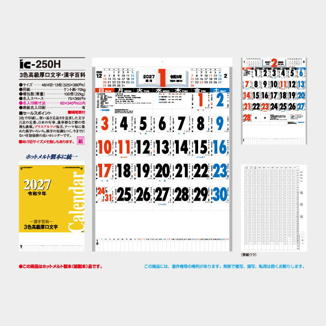 ホーム > 商品 > 壁掛けカレンダーから探す > 壁掛けの特徴から探す > ホットメルト(紙製本) > IC-250H 3色高級厚口文字・漢字百科 名入れカレンダー