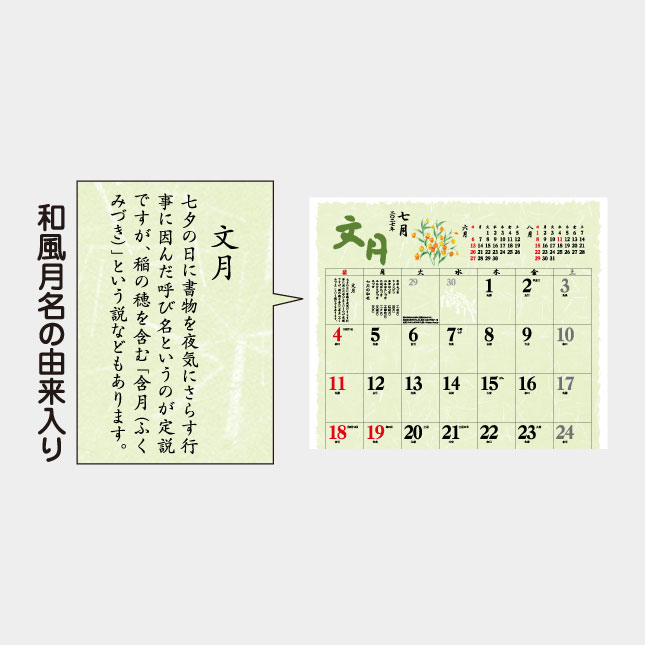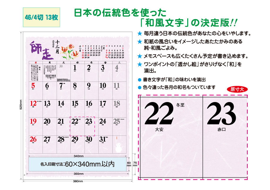 メモ欄も大きく実用的で、いろいろ違った呼び方の和風月名もついています。