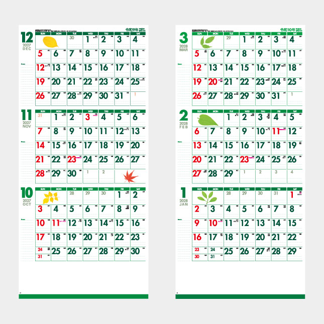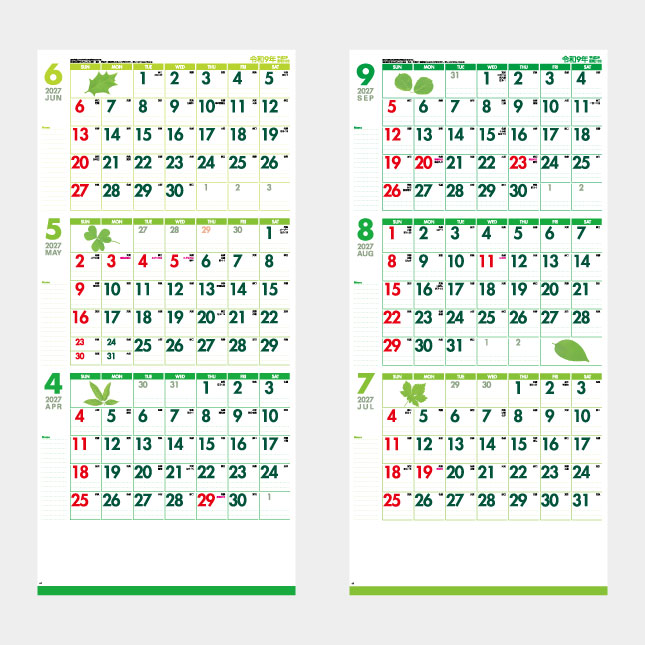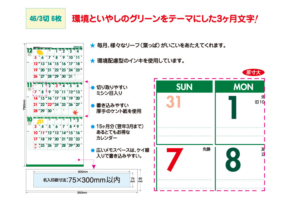 資源の効率的な活用を考えた6枚ものカレンダー。植物由来の原料を使用した環境配慮型のインキを使用しています。