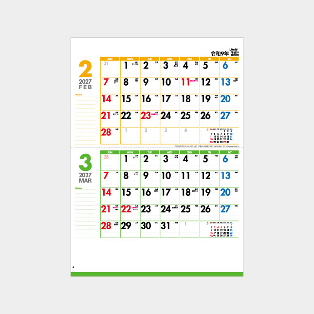 ミシン目入りで常に翌月を表示でき、翌年2月まで使用できる14ヶ月カレンダーです。