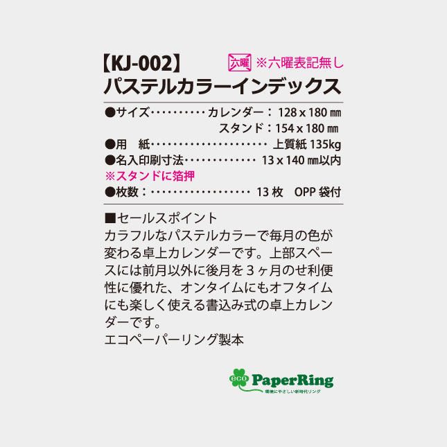 ホーム > 商品 > 卓上カレンダーから探す > ペーパー&エコリング製本 > KJ-002 卓上 パステルカラーインデックス