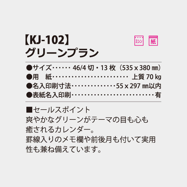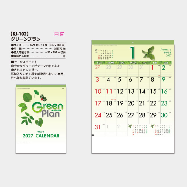 爽やかなグリーンがテーマの目も心も癒やされるカレンダー。