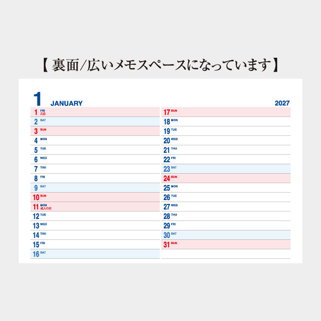 シンプルなデザインでメモ書きもしやすく、裏面には、スケジュール管理に便利な広いメモスペースが付いています。