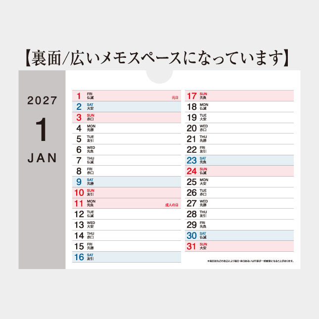 大きな文字で見やすく。裏面にはスケジュール管理に便利な広いメモスペースが付いています。