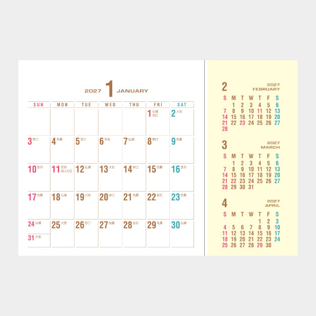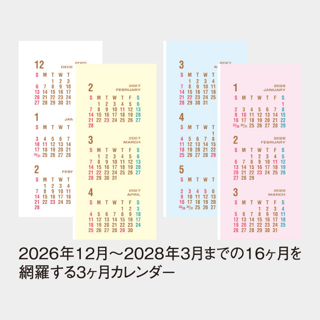 ・左側(3ヶ月カレンダー)は、2025年12月〜2027年3月までの16ヶ月を網羅しています。