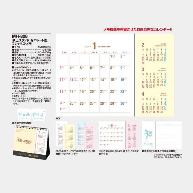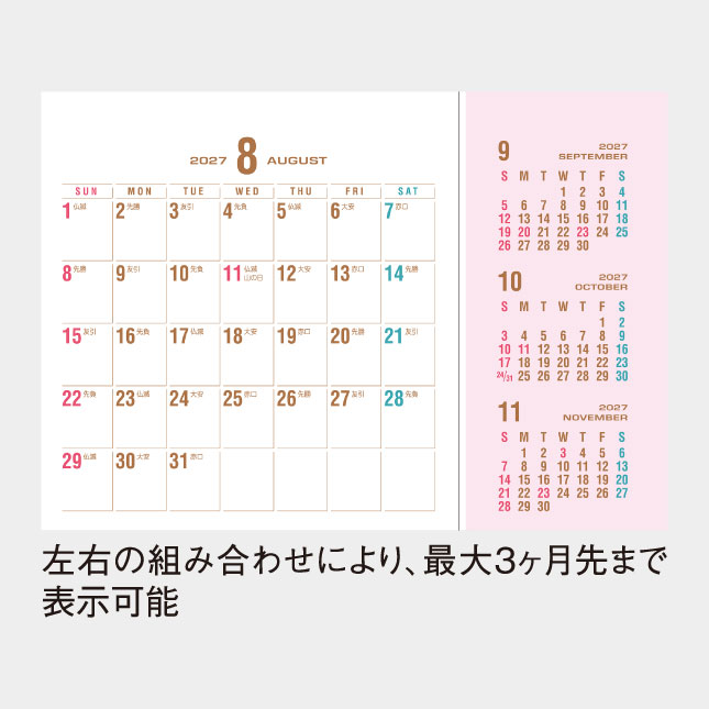 ・2枚のセパレート型で、左側(3ヶ月カレンダー)と右側(本文)を組み合わせて使える、自由自在で多機能な卓上カレンダーです。