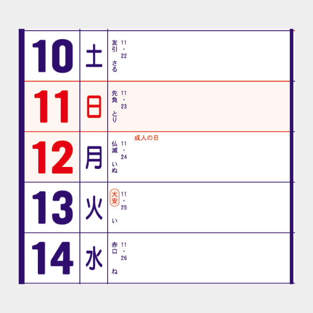 予定の書き込みに最適な実用カレンダーです。日曜日の赤ラインが週をセパレートしています。格言入りです。