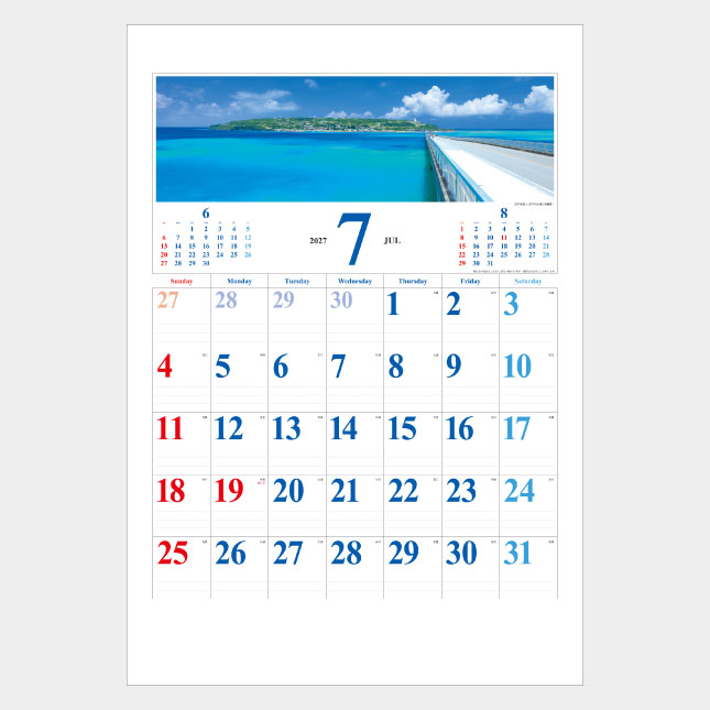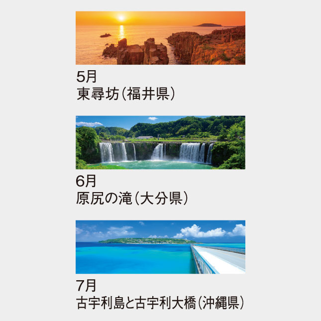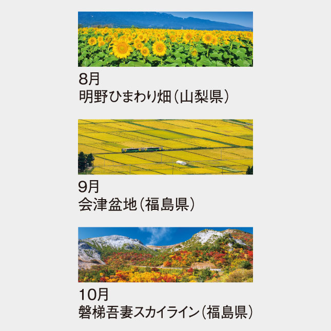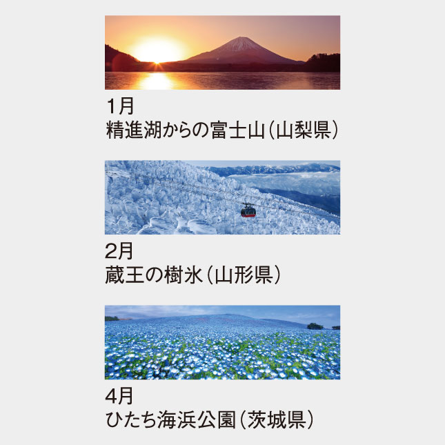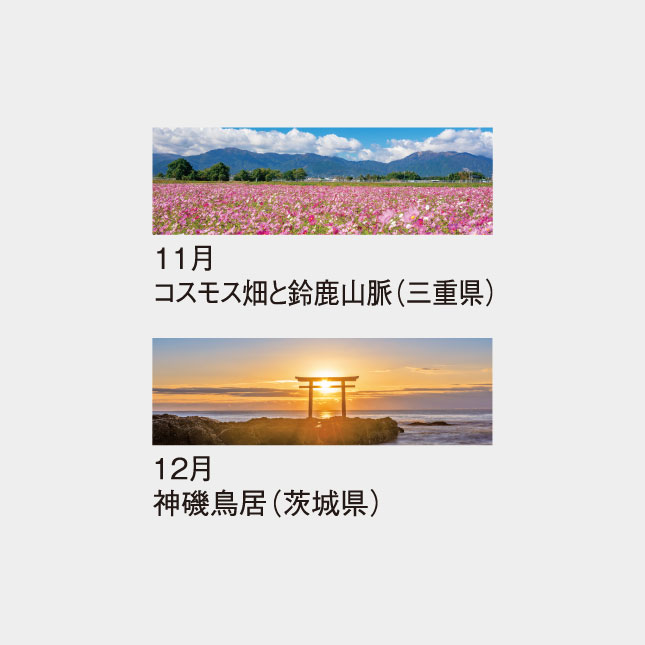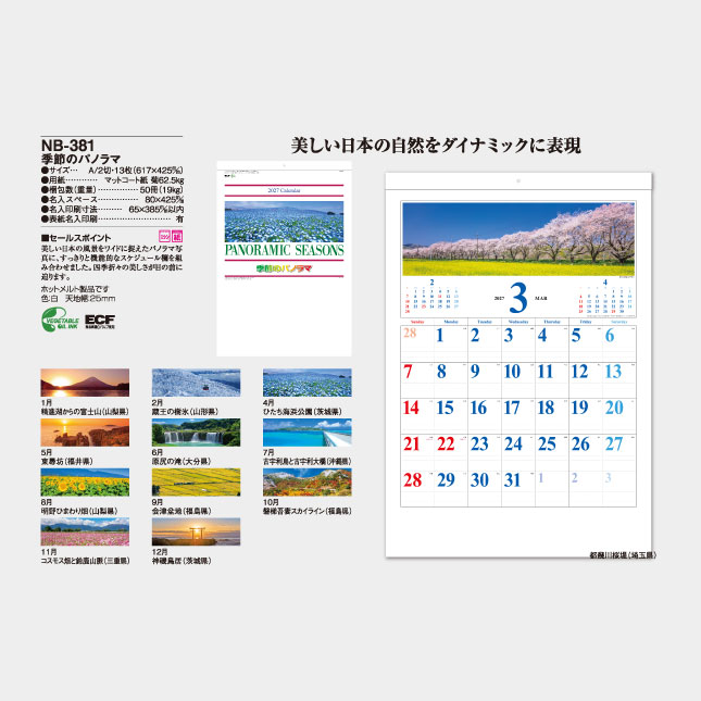 美しい日本の風景をワイドに捉えたパノラマ写真に、すっきりと機能的なスケジュール欄を組み合わせました。