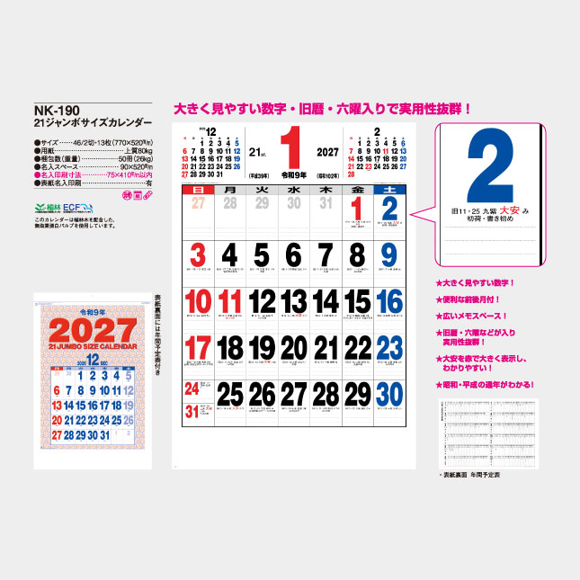 21ジャンボサイズカレンダー NK-190 の特徴
