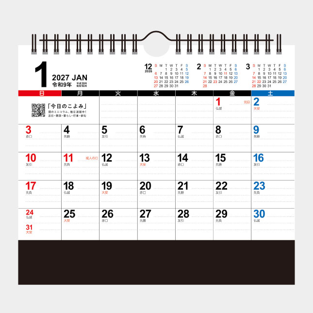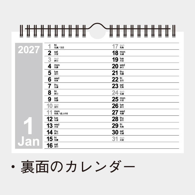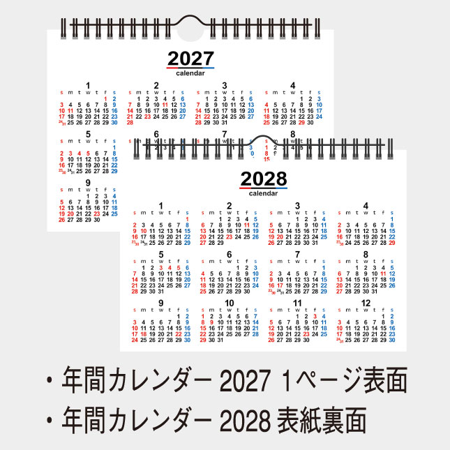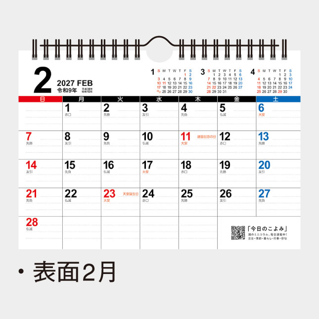 玉部分(カレンダーの数字)は土曜日を青にした3色表記。今年と来年の2年分の年表もついています。