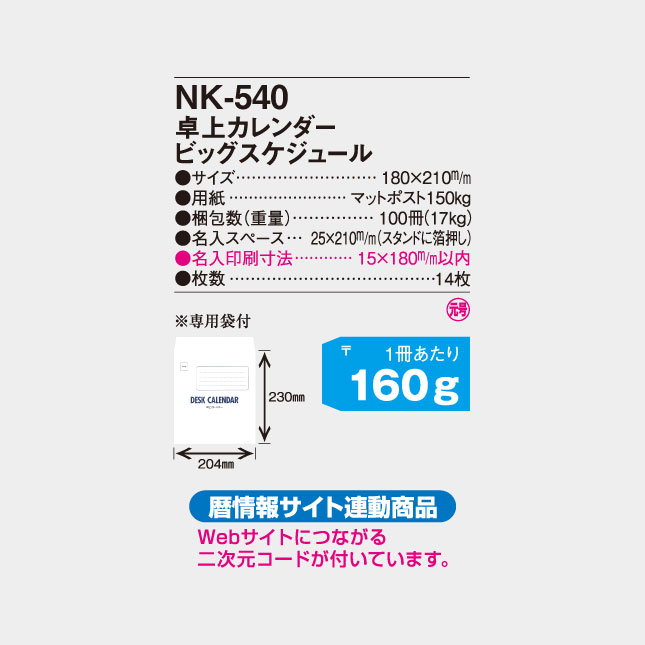 ワンサイズ大きめの卓上カレンダーとして人気の高いNK-540 卓上 ビッグスケジュール。 玉部分のメモ欄が広く、罫線がひいてあり書き込みがしやすくなっています。 前後月は3ヶ月分、年表も2年分付いており、スケジュール管理がしやすい卓上カレンダーになっています。