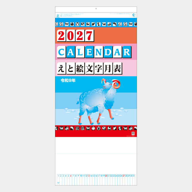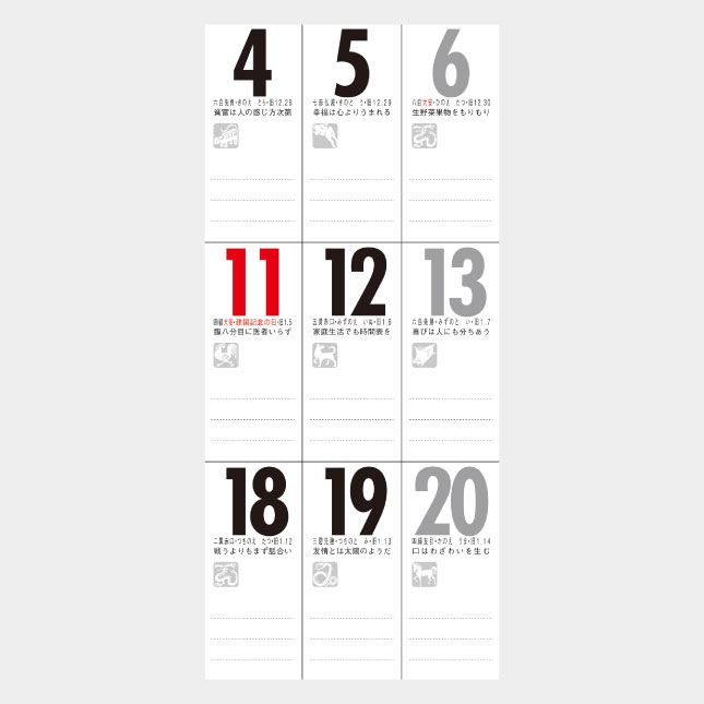 六曜、旧暦、生活標語、干支イラスト、主要行事入り。