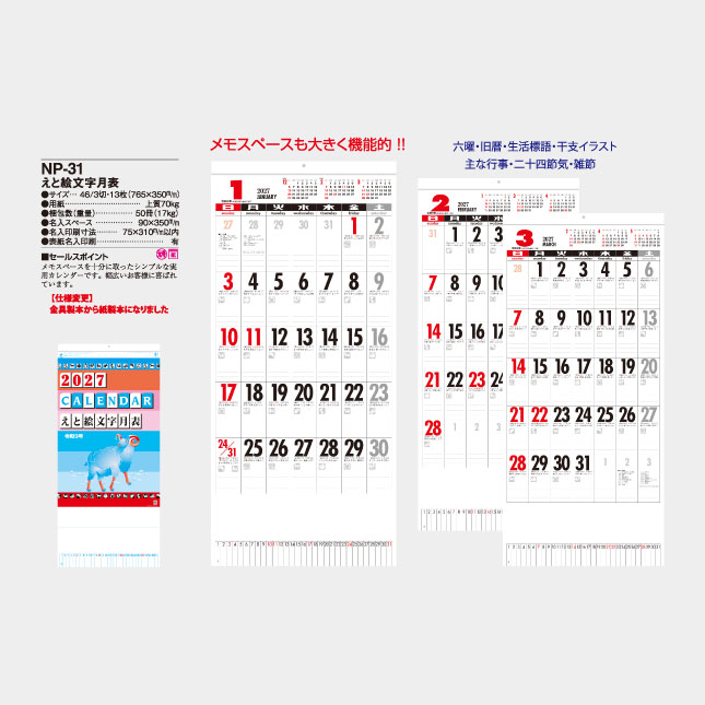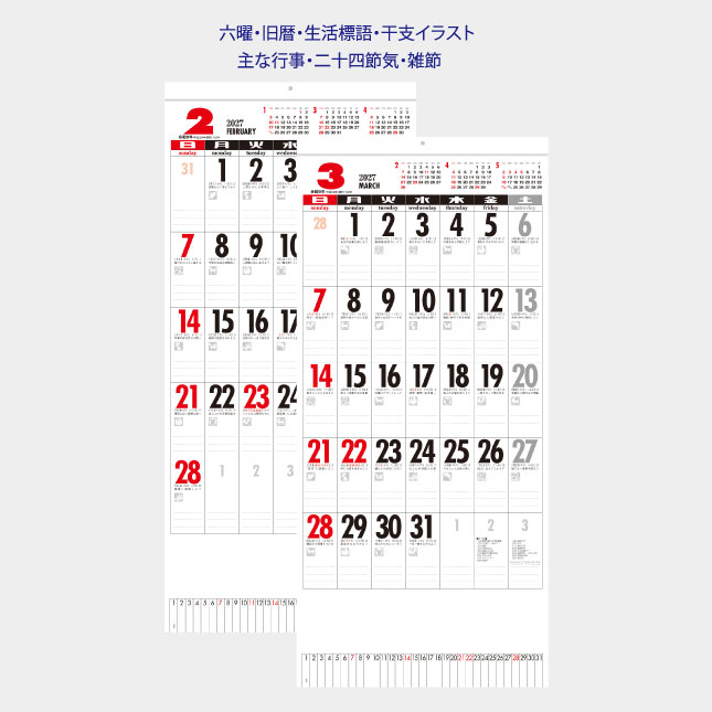 暦を網羅、メモスペース充実で機能的なカレンダー。