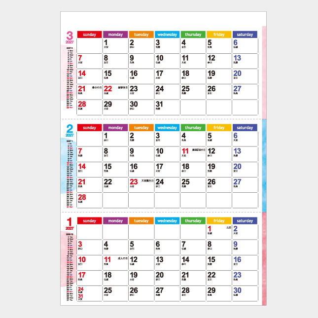 高さ240mm、3ヶ月表示の縦型卓上カレンダーです。