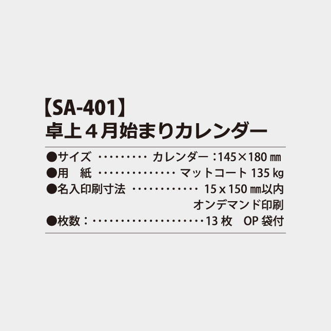 ホーム > 商品 > 卓上カレンダーから探す > 卓上の特徴から探す > 4月始まり > SA-401【4月始まり】卓上4月始まりカレンダー