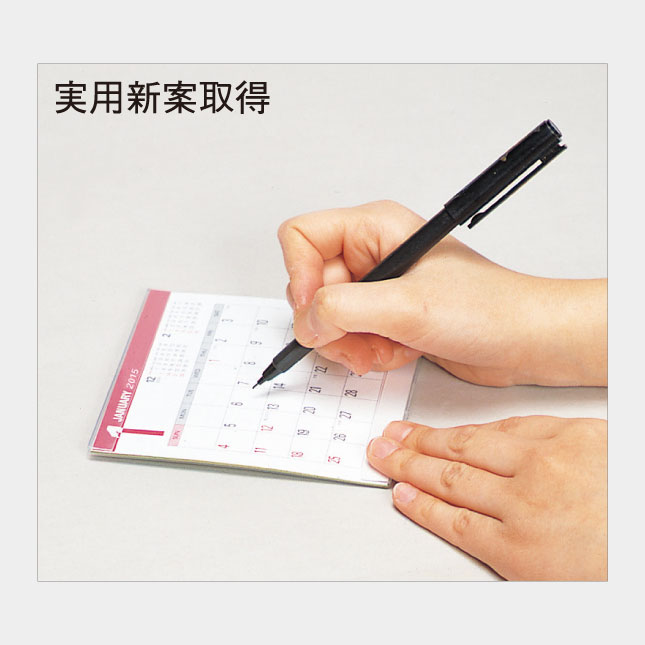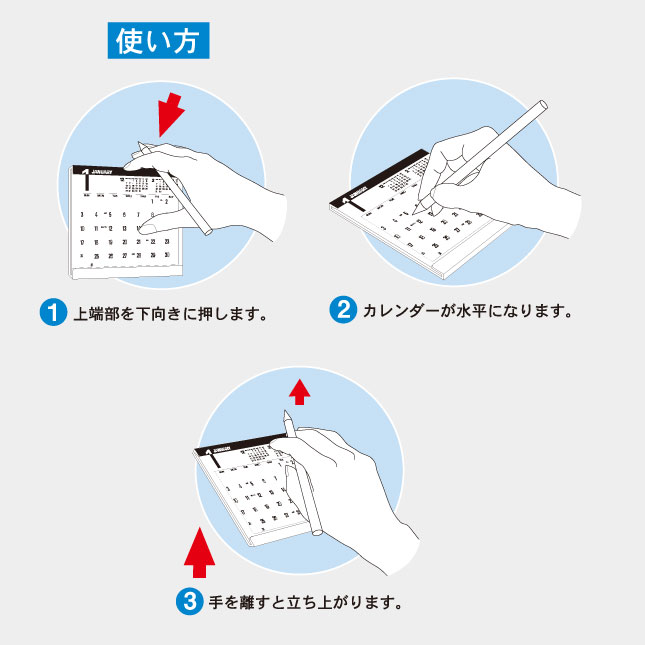そのまま倒せばメモができ、手を離せば自動的に立ち上がる便利な卓上カレンダー。