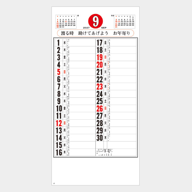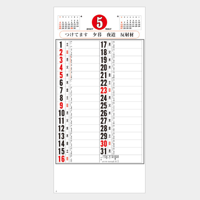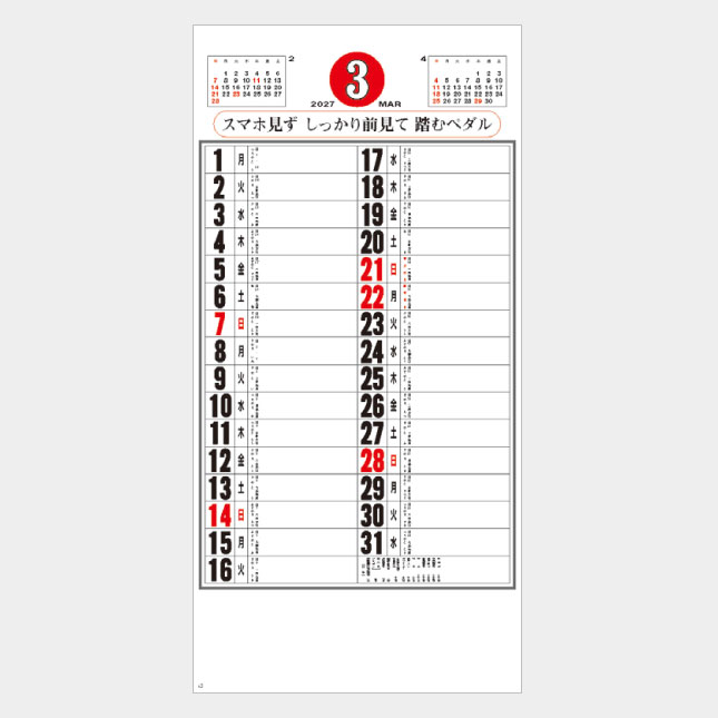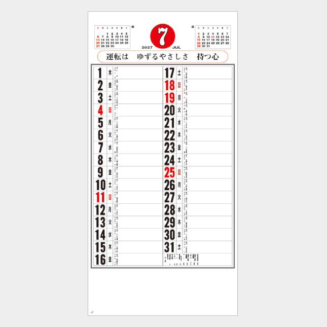 使いやすいサイズと見やすい日付、書き込みの容易なメモスペースに交通標語をあしらった実用的なカレンダーの定番です。