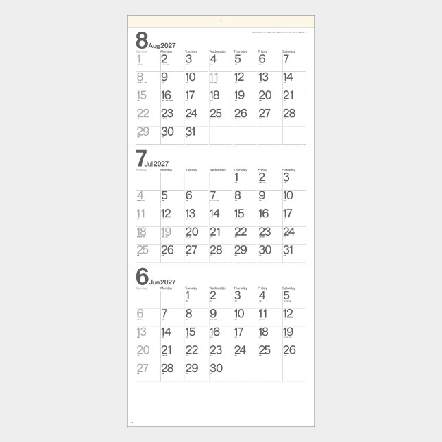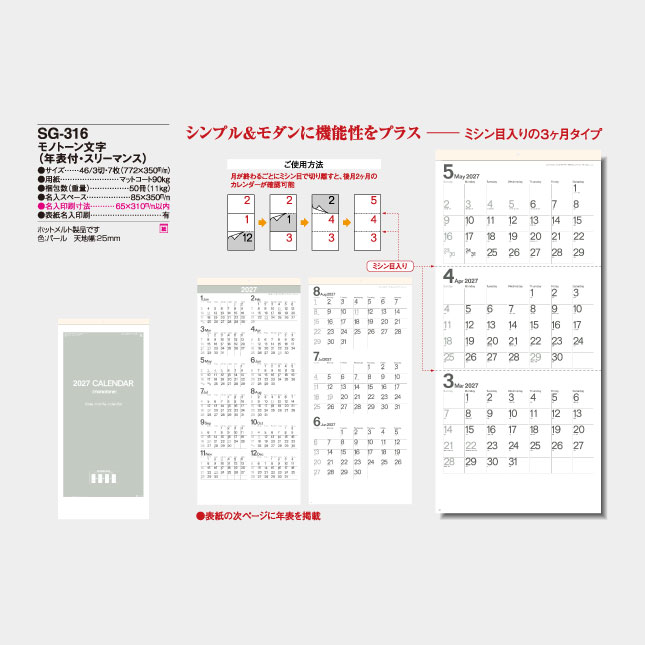 月が終わるごとにミシン目で切り離すと後月2ヶ月のカレンダーが確認できます。