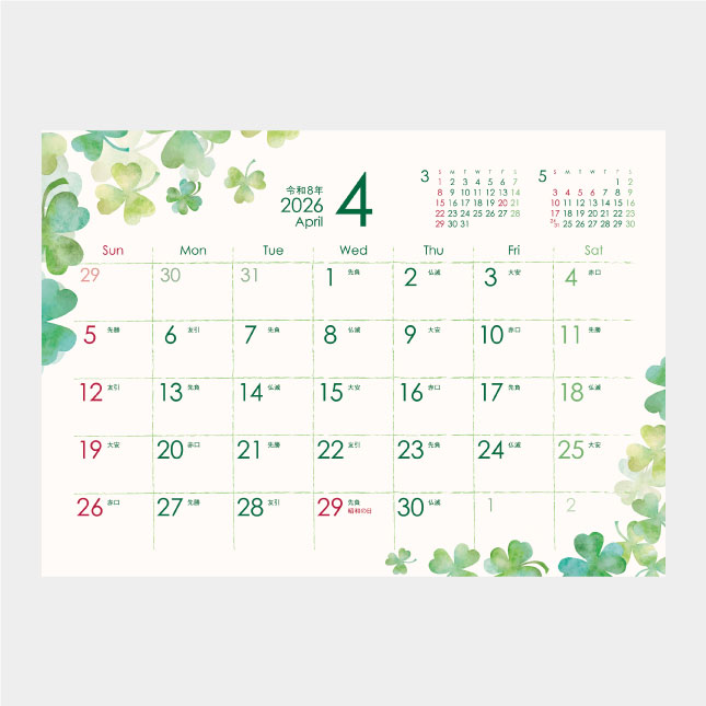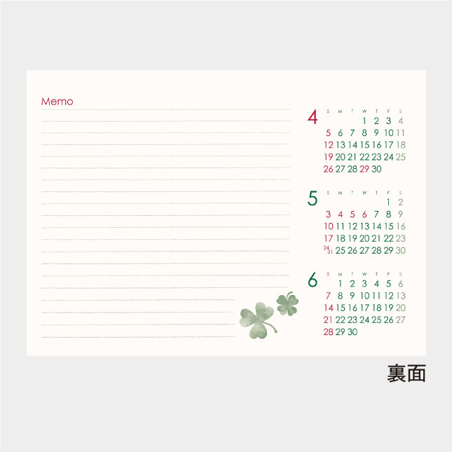人気のクローバーカレンダーです。さわやかな絵柄が白い台紙によく合います。