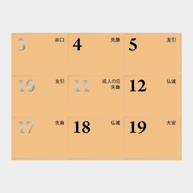 月数字・日曜日、祝日を銀箔で表現した高級感のあるカレンダーです。