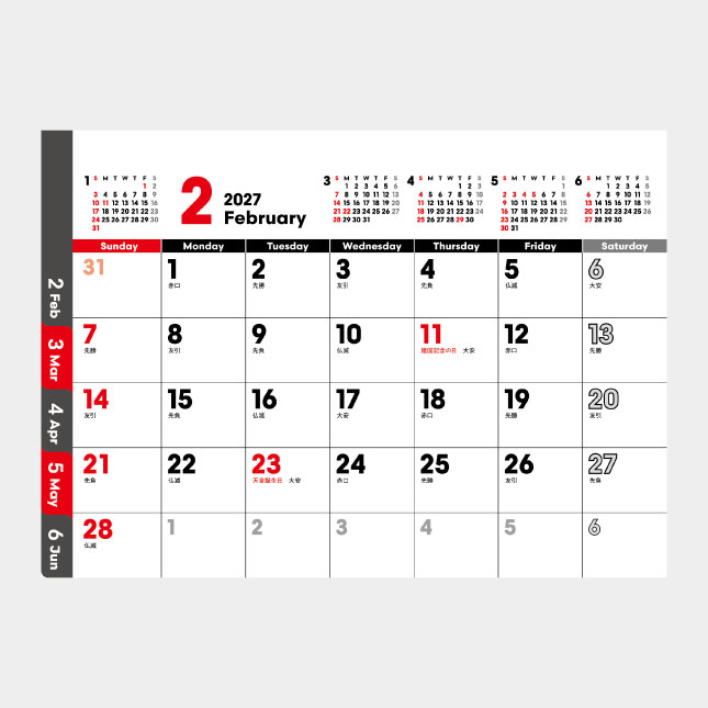 月により5種、6週のカレンダーを掲載し、長期スケジュールの管理に最適な仕様です。