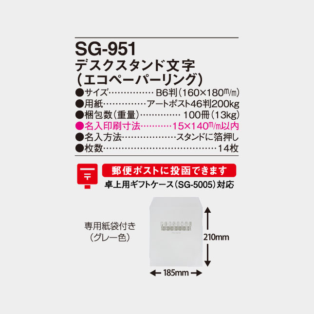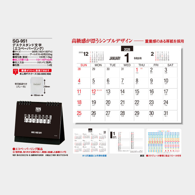 このSG-951デスクスタンド文字は卓上カレンダーとして業界で1位の販売数を誇る名入れカレンダーといわれています。 エコペーパーリング仕様でシンプルなカレンダー部分が特徴です。カレンダー部分は2色印刷で派手さはありませんが、前後月1ヶ月のカレンダーを表示し、メモ欄も十分とってあり、12月裏面には年表を掲載するなど機能性は高いカレンダーです。