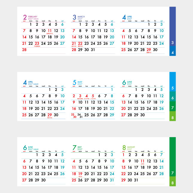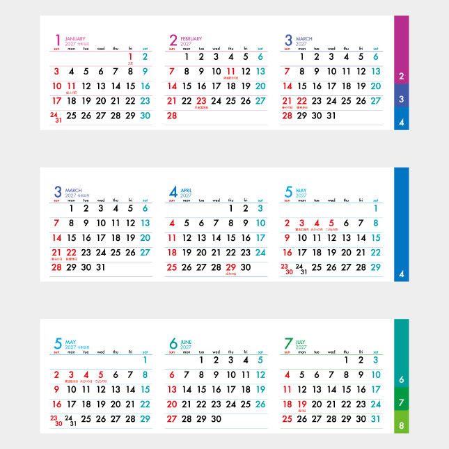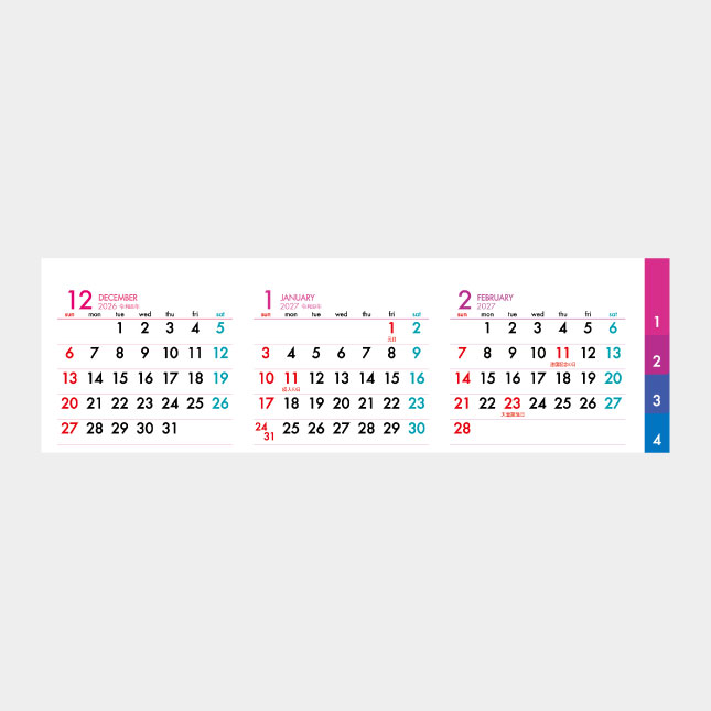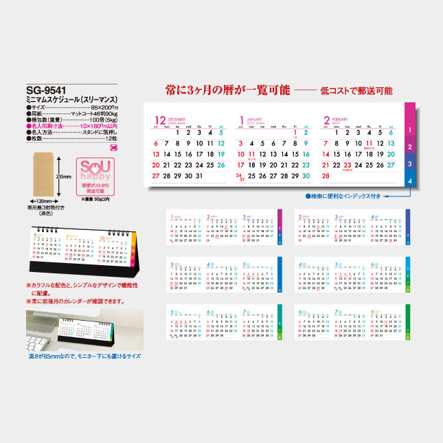 常に3ヶ月の暦が一覧可能。低コストで郵送可能