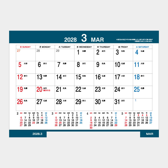 カレンダーは翌年の3月まで使用頂け、毎月の予定と、前月・当月・翌月・翌々月の4ヵ月が一度に見られます。