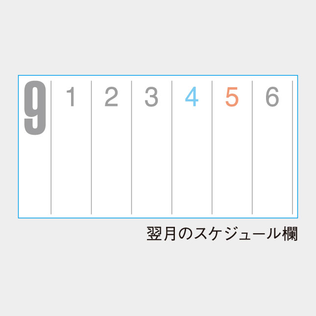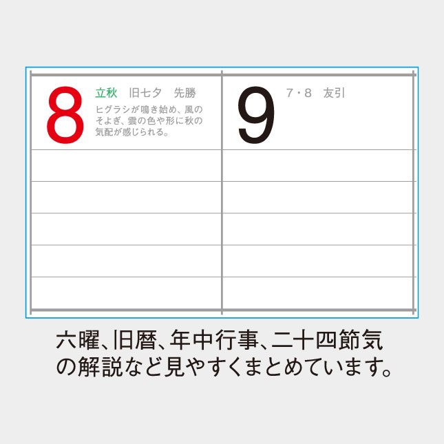 全体にスッキリとしたさわやかなデザインは会社や事務所にピッタリ、またご家庭のインテリアとしても人気のカレンダーです。