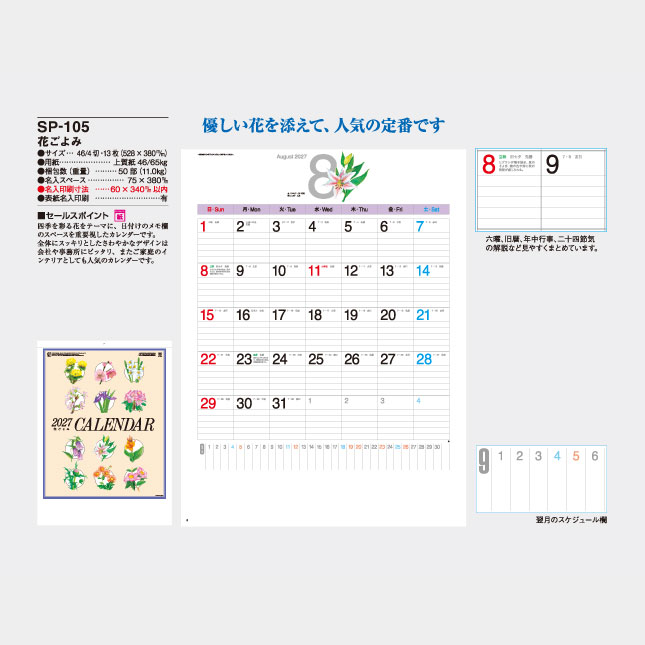 四季を彩る花をテーマに、日付けのメモ欄のスペースを重要視したカレンダーです。