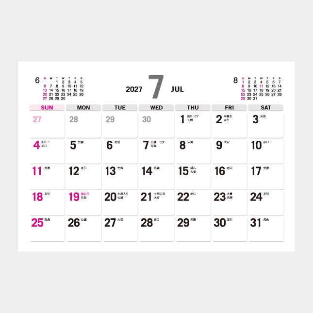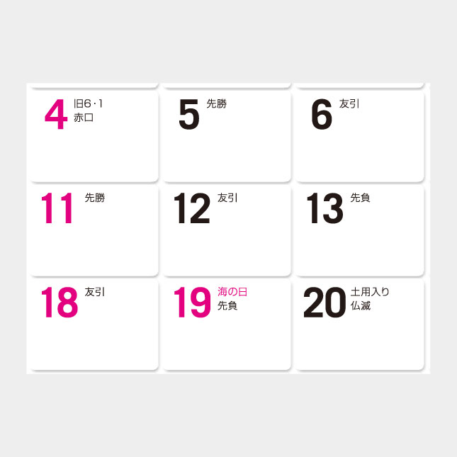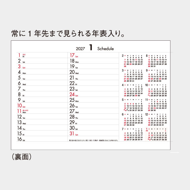シンプルな2色刷、表面は六曜入り、裏面はスケジュール欄のメモスペース付き。