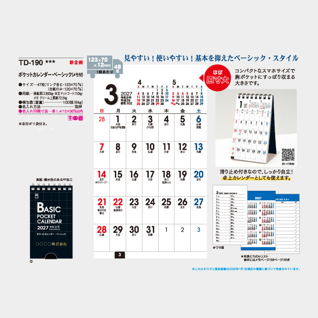 卓上 ポケットカレンダー・ベーシック(メモ付) TD-190 の特徴