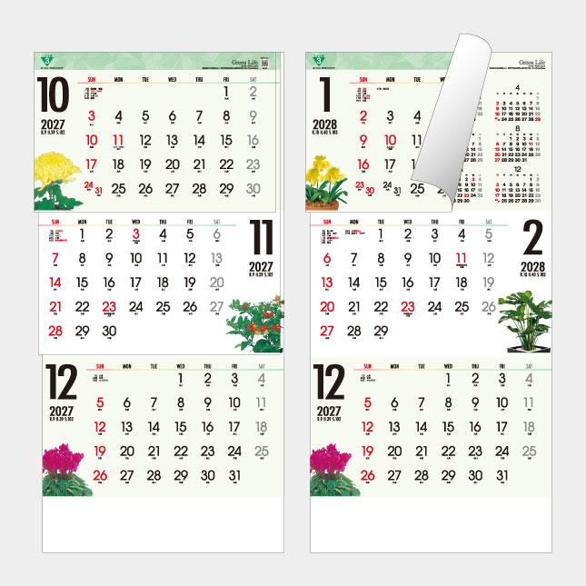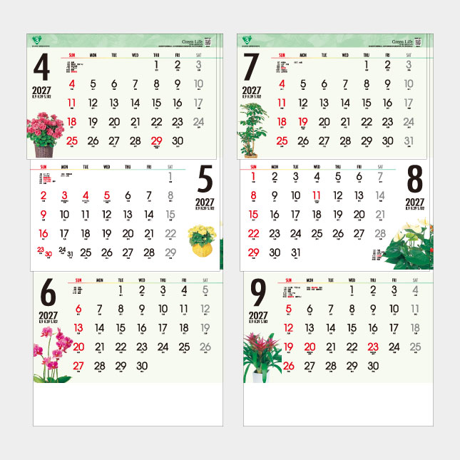 植物のイラストがさわやかな3ヶ月タイプのカレンダー。
