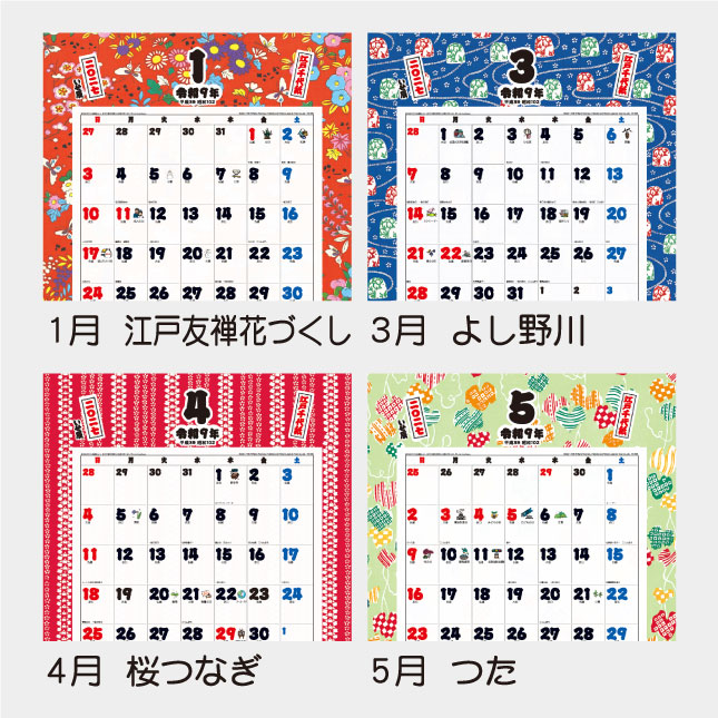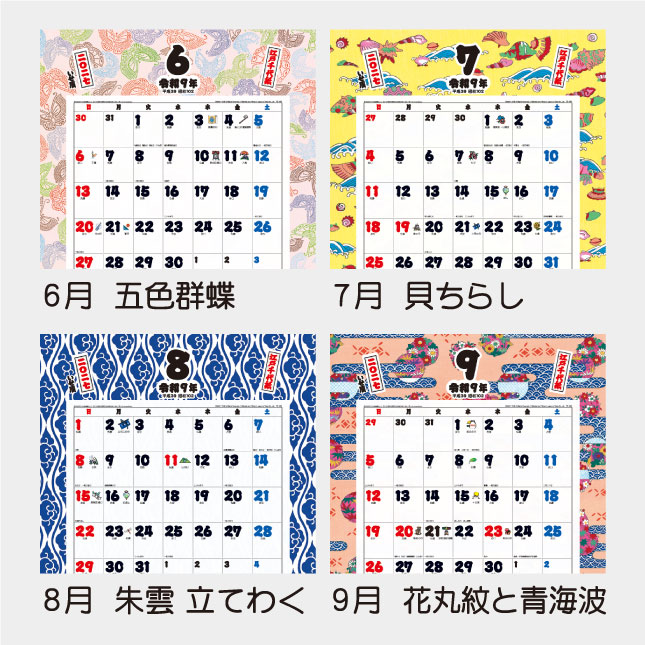 6週表示で見やすい数字。旬の食べ物・季節の行事がわかる歳時記掲載。行事アイコン付き。