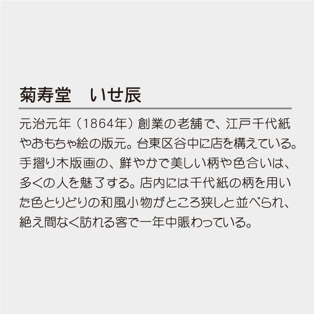 菊寿堂 いせ辰 元治元年(1864年)創業の老舗で、江戸千代紙やおもちゃ絵の版元。台東区谷中に店を構えている。手摺り木版画の、鮮やかで美しい柄や色合いは、多くの人を魅了する。店内には千代紙の柄を用いた色とりどりの和風小物がところ狭しと並べられ、絶え間なく訪れる客で一年中賑わっている。