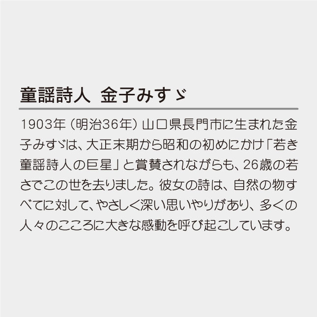 1903年(明治36年)山口県長門市に生まれた金子みすゞは、大正末期から昭和の初めにかけ、「若き童謡詩人の巨星」と賞賛されながらも26歳の若さでこの世を去りました。